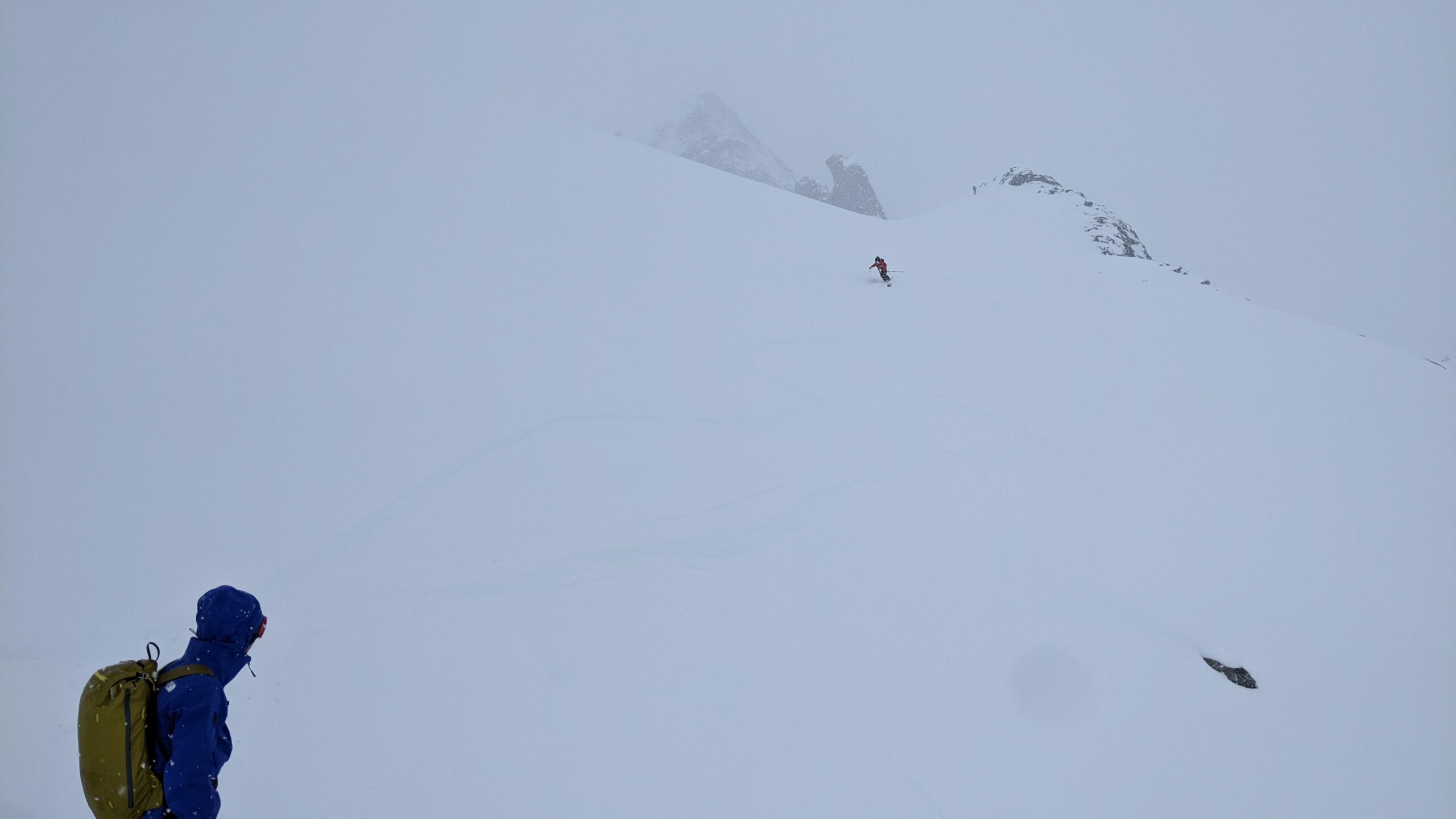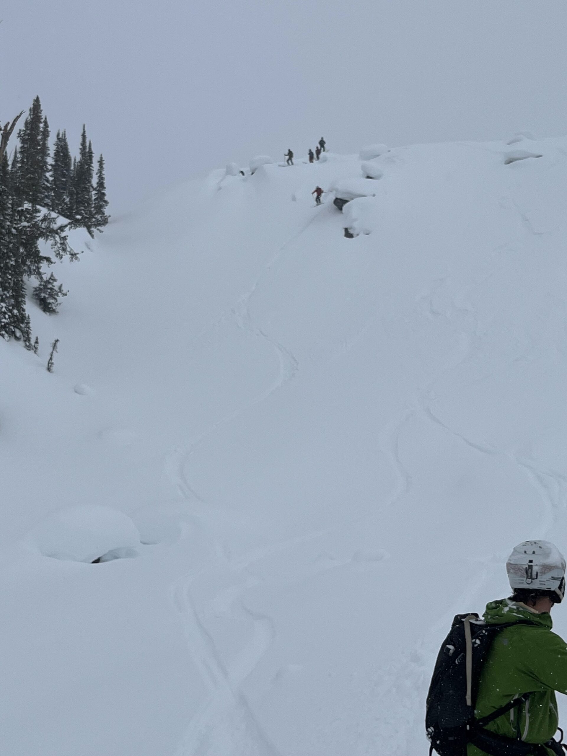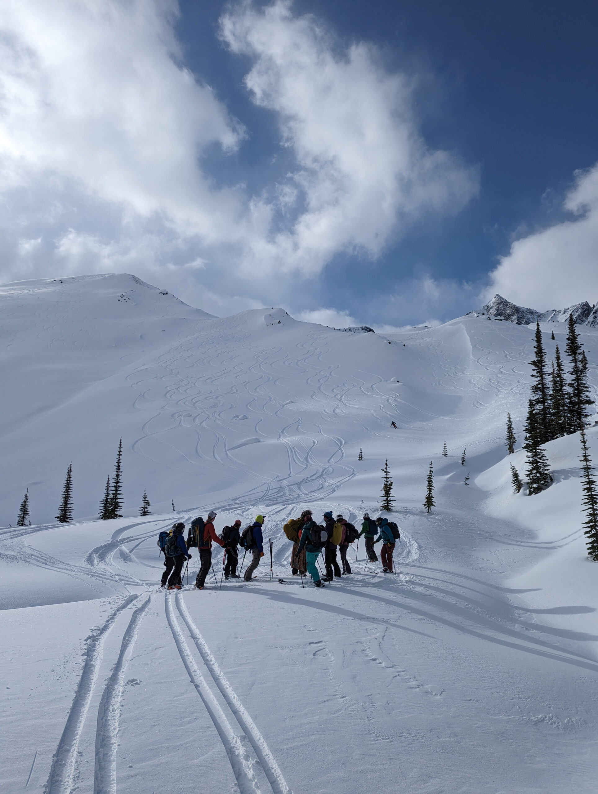 Our first day of sun was on day four, and the getting was great. Our wishes for alpine days were answered. I was in a group of four who skied the Houdini main couloir. Throughout the ascent, we assessed snowpack, vocalized observations, checked in with comfort levels, and proceeded with stoke and caution. 90% of the way up we encountered some wind slabbing and decided to transition and ski an epic 1.5k ft. of steep powder. At the bottom of the curtain below, I heard my friend Nathan yell excitedly into the radio from our transition point in the couloir. Moments later his actual yell reached us where we stood. It felt great to ski something that felt substantially steep and push our comfort levels all while communicating clearly and openly, and to make the decision to transition and ski when and where we did.