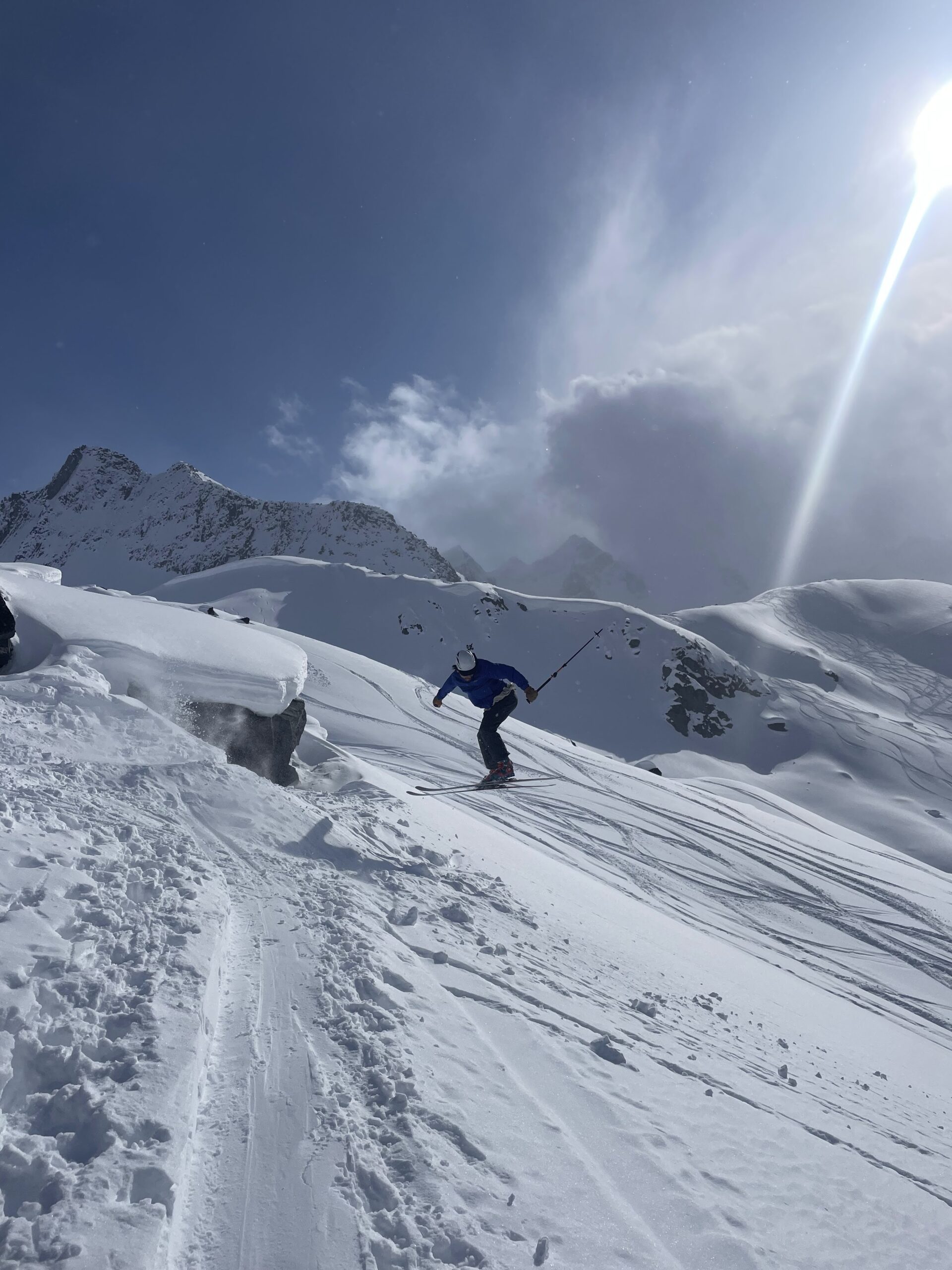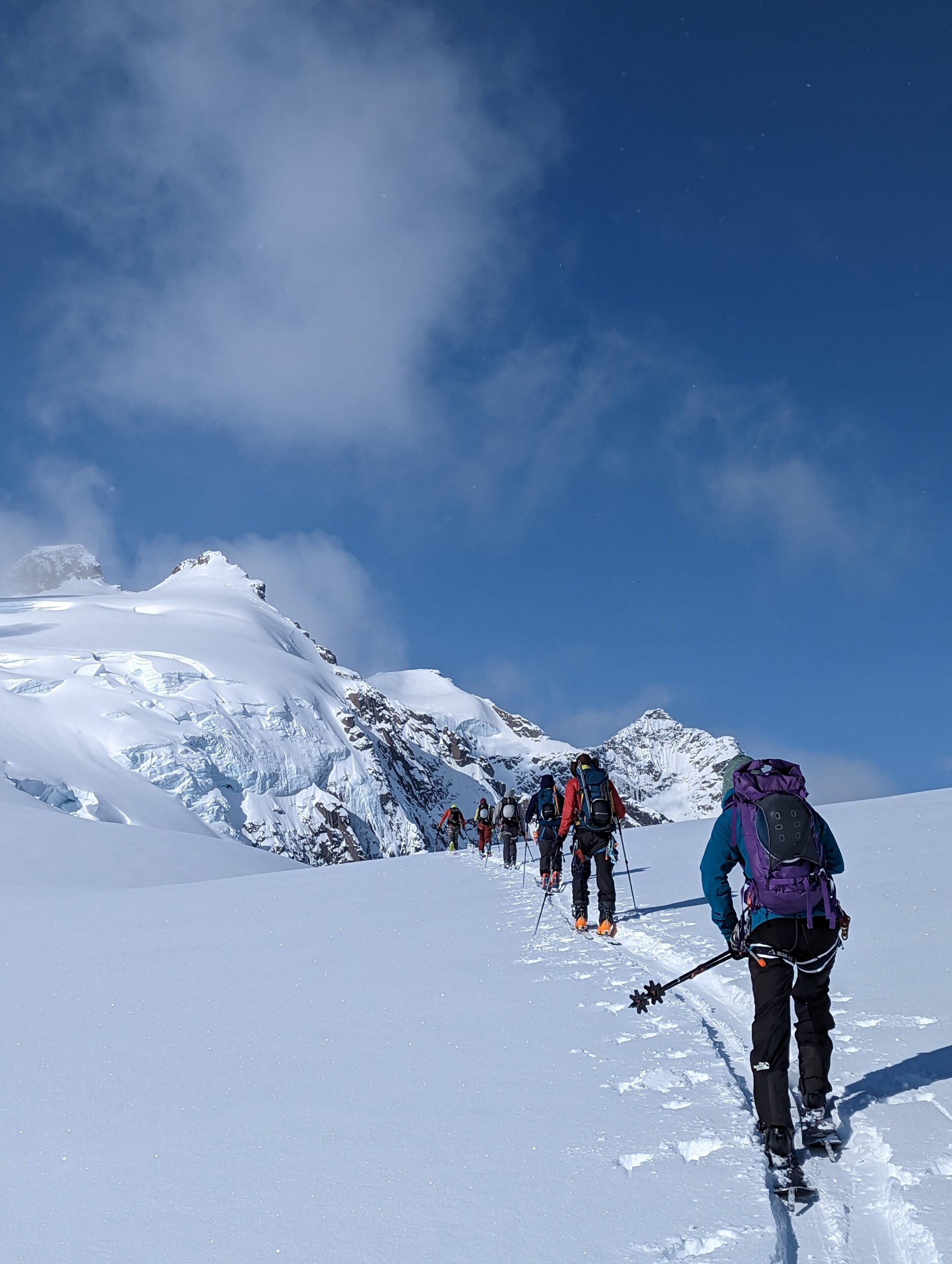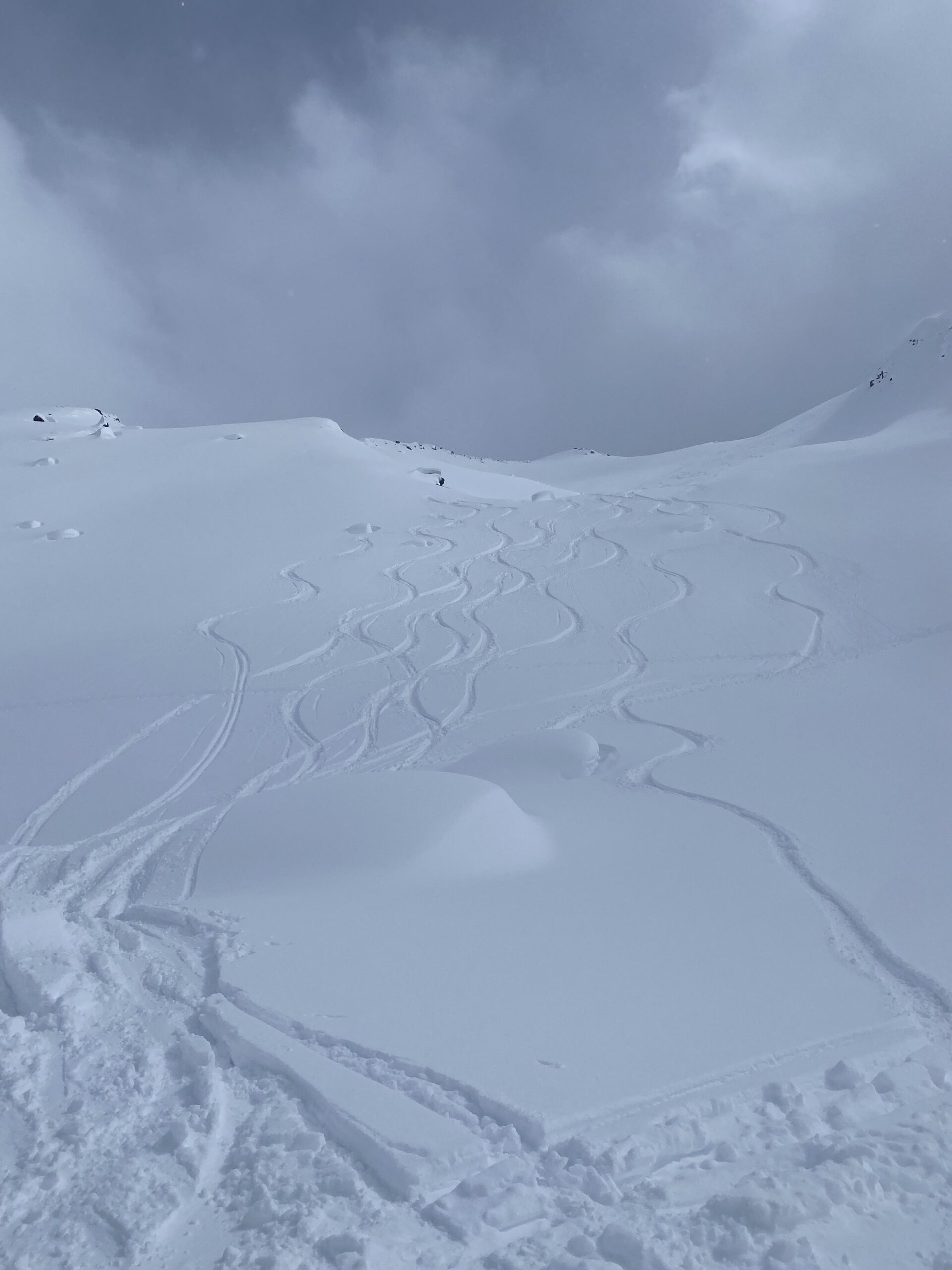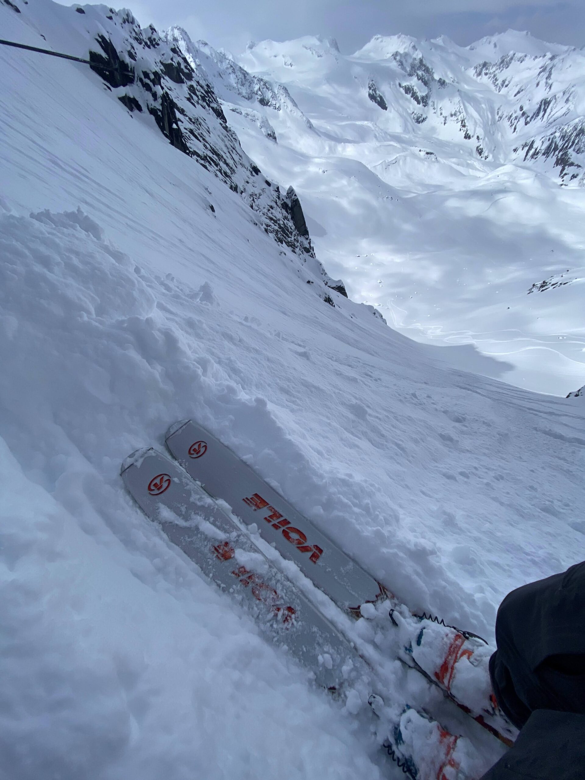 Our first day of sun was on day four, and the getting was great. Our wishes for alpine days were answered. I was in a group of four who skied the Houdini main couloir. Throughout the ascent, we assessed snowpack, vocalized observations, checked in with comfort levels, and proceeded with stoke and caution. 90% of the way up we encountered some wind slabbing and decided to transition and ski an epic 1.5k ft. of steep powder. At the bottom of the curtain below, I heard my friend Nathan yell excitedly into the radio from our transition point in the couloir. Moments later his actual yell reached us where we stood. It felt great to ski something that felt substantially steep and push our comfort levels all while communicating clearly and openly, and to make the decision to transition and ski when and where we did.