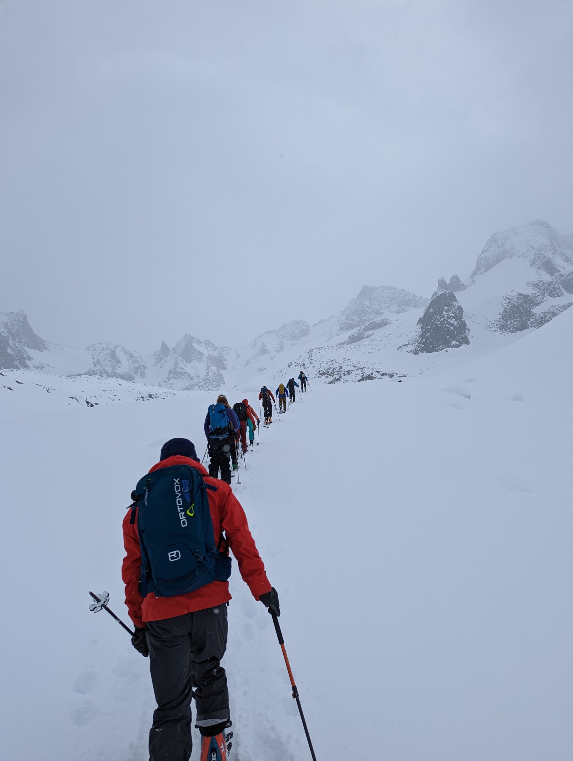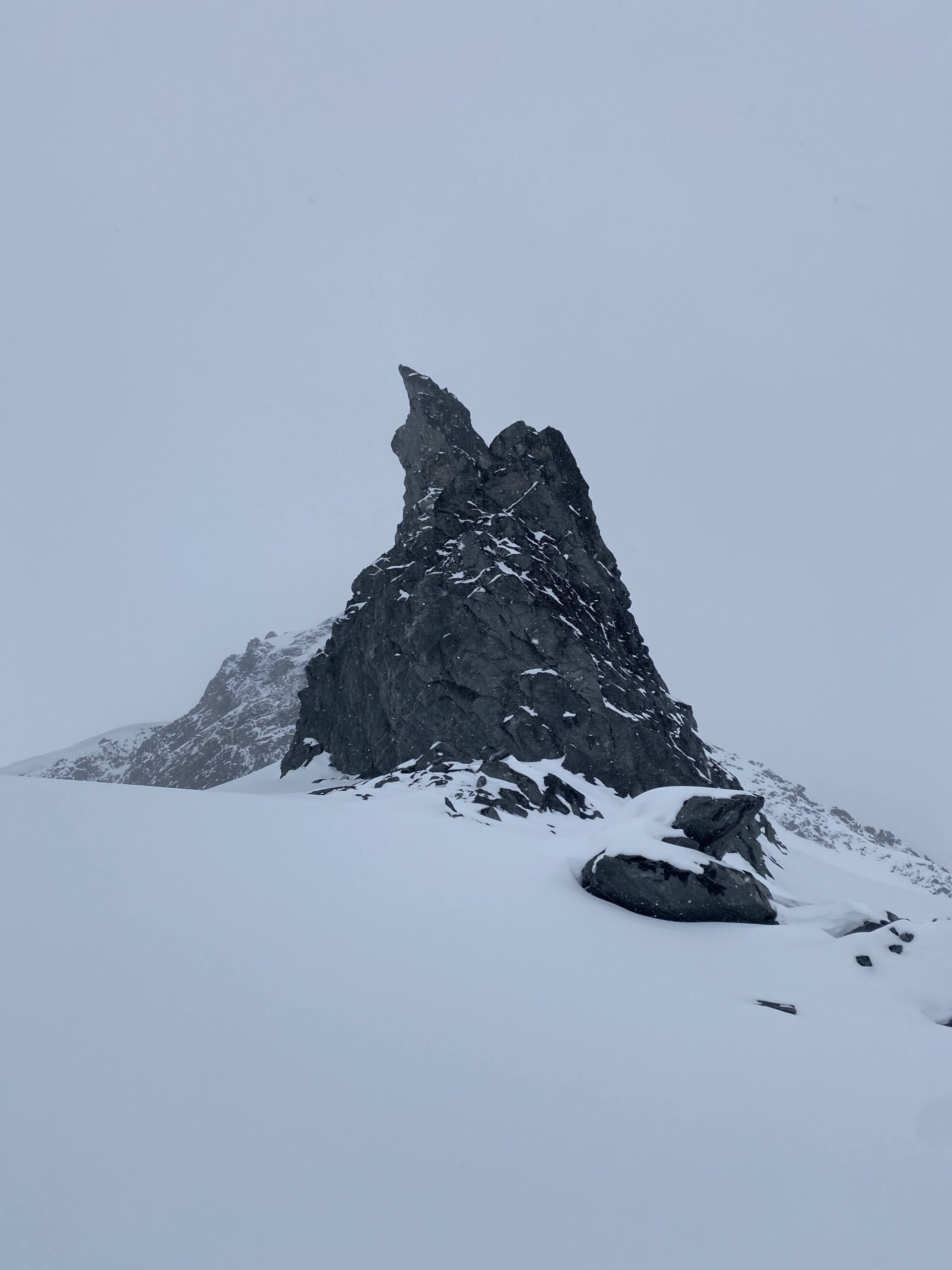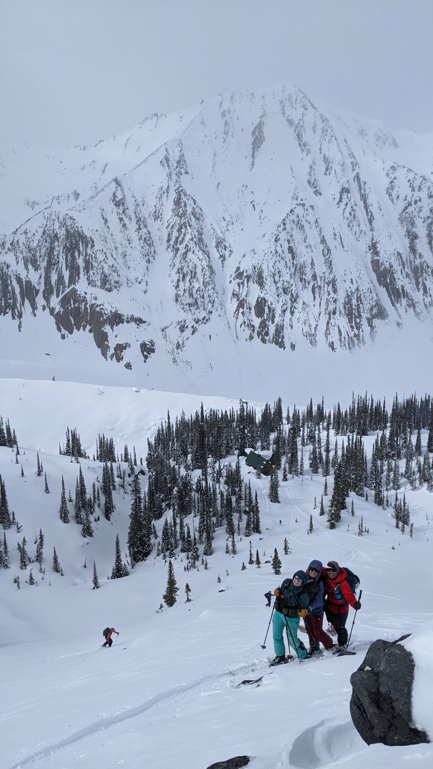 Everyone was psyched at the stunning surroundings, and we collectively realized that despite the dynamic morning and overcast conditions, the day still held many hours of light in our new northern location. So, we just kept skinning to just below Friendship Col and a stark, dark metamorphic rock feature I began calling “the fin”. Clouds got thicker and we all decided to flip it and head back to get cozy for our first evening in the hut. Folks split up and skied different lines with varying degrees of geological visual cues in the flat light. Vertigo was experienced and persevered through with laughs and snow-covered butts.