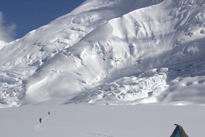 Glacier camping 101: don’t camp under overhead hazard of avalanches or seracs, and make certain your camp location isn’t sitting on top of an open crevasse monster ready to swallow you after one wrong step.