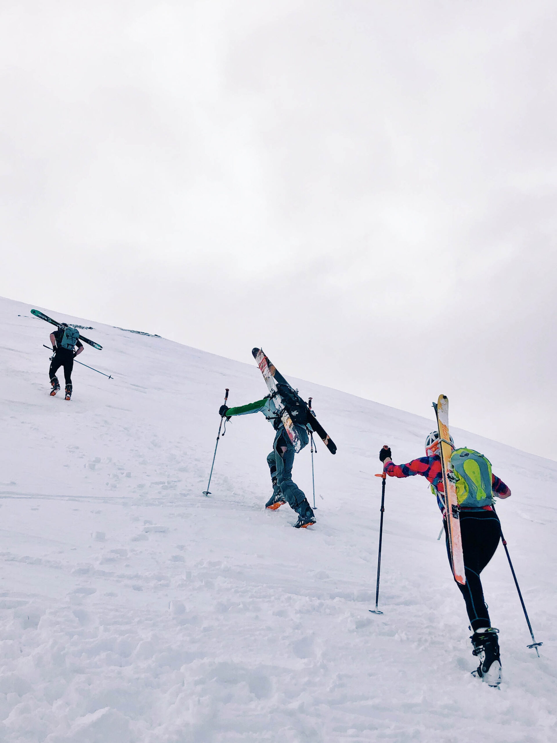 This annoying little phrase for dressing appropriately has never been more relevant. Sweat is the enemy, so you definitely don’t want to be wearing insulated layers or a hard shell for your skimo race. Especially for shorter, sprint-style races, try to dress as lightly as possible, as you are going to get worked on the way up. I typically wear thin gloves, lightweight hiking pants or leggings, a thin wool t-shirt, and my Houdini windbreaker. Sometimes the Houdini even comes off. In longer races, I still dress in light clothing, but carry an extra layer in my pack just in case things go awry.