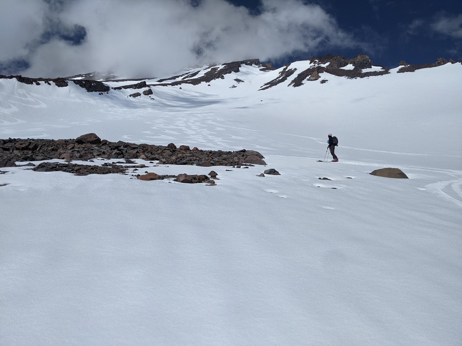 On either side of the wide strip of snow were low ridges of fragmented Red Banks pumice and dark, broken rock from basaltic, lower viscosity lava flows. We leap-frogged five or six times before taking turns airing over rock through a choke into the otherwise continuous snow surface covering the wide gulley directly beneath Casaval Ridge. We skied side by side through the remaining rolling slopes before carrying speed across the flat, open drainage at about 9,300 ft. With a moderate dose of “shwacking” through manzanita thickets and taking skis off and putting them back on once or twice to crawl over loose rock, we traversed back into the broad opening of Avalanche Gulch at about treeline, or a little less than 8,000 ft. We were more or less exactly where we found ourselves at sunrise 11 hours earlier. We gazed back up the Misery Hill cone to Misery Hill itself, in awe of the effort now behind us and the summit block that we knew lay hidden behind what we could see of the Hotlum cone.