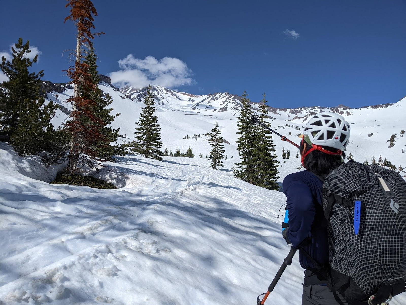 Spring was in full swing when Nathan and I arrived. Recent storms brought new snow to upper elevations and shrouded visibility with cloud cover in the week leading up to our attempt, but we had ourselves a window of mostly clear weather. It was late May of a historic year of snowfall, so the white stuff lingered at lower elevations on the mountain, allowing us the distinct privilege of stepping from a dry parking lot directly onto snow to start ski touring at 6,900 ft.