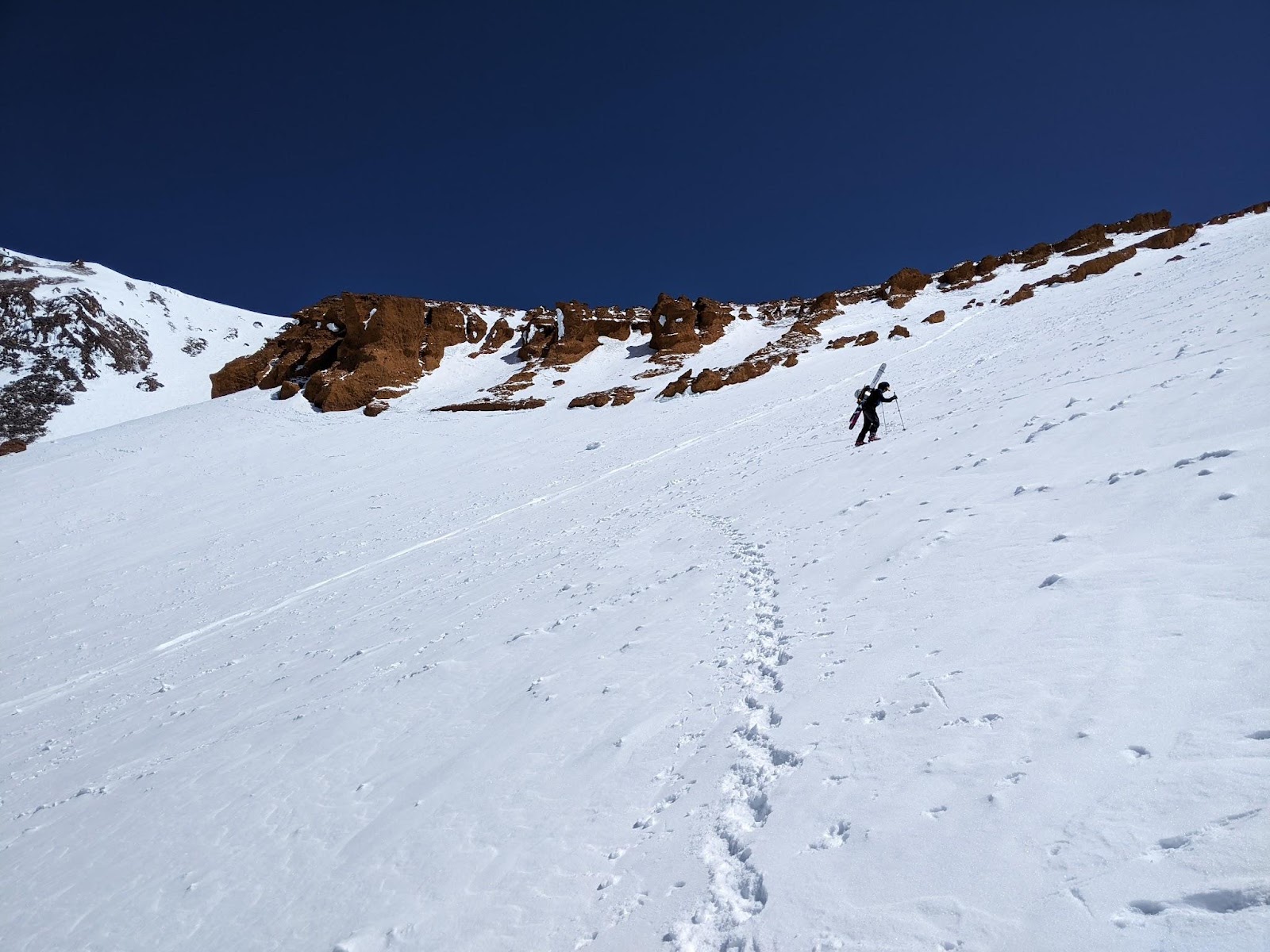 At the entrance to the West Face, Nathan and I took care of our fueling needs, drinking our remaining water in excess, snacking more ravenously than any prior break. We were energized for the original main goal of the day, a ton of awesome skiing together. After we transitioned to ski downhill and discussed our plan for safe descent, I looked back up towards the summit. From our location, Misery Hill was out of our line of sight, and the Hotlum summit stared back. I recognized the hold that fortress now had on my mind and knew that the mountain itself was the standout of this experience, even before we started skiing.