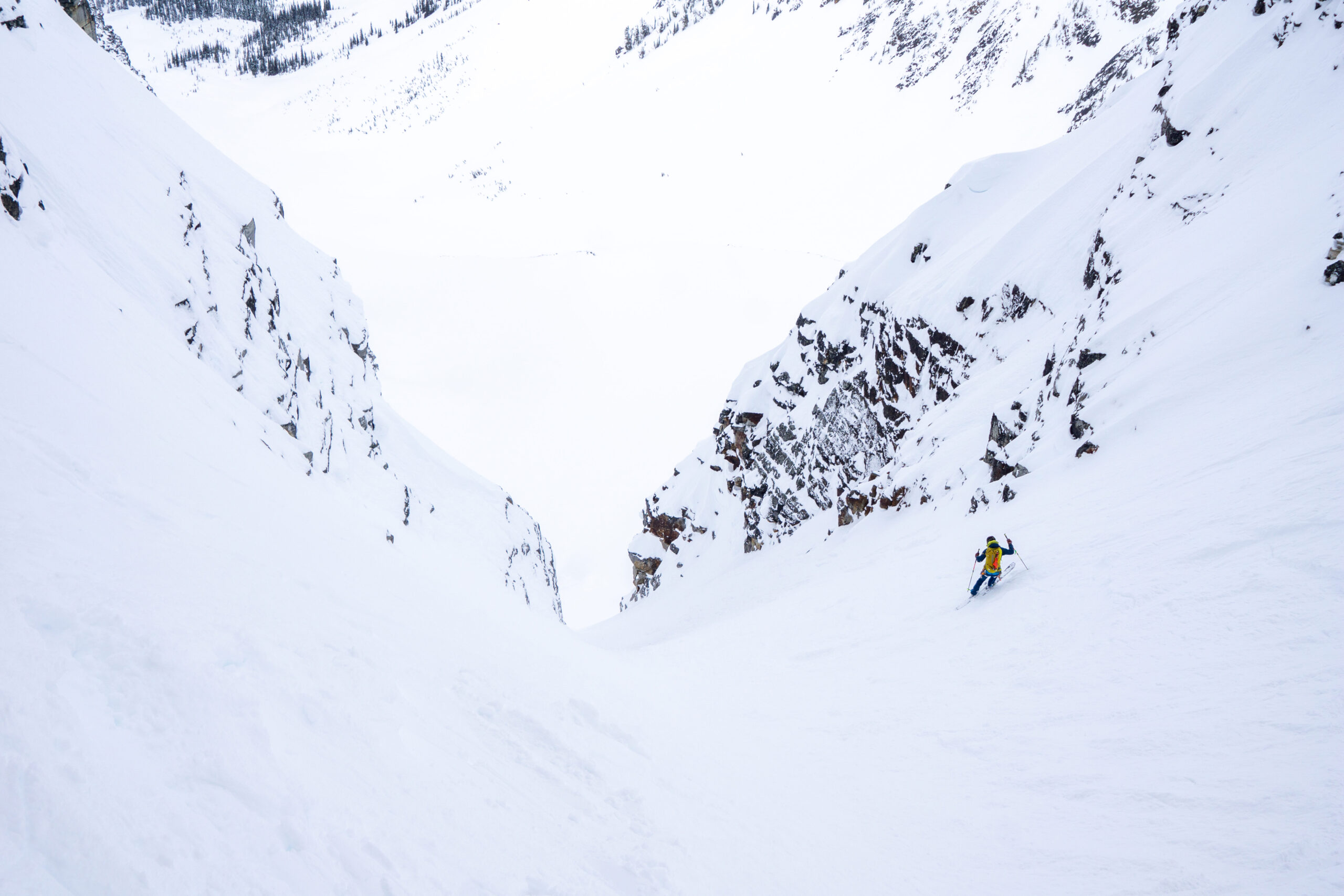 Our first instinct when encountering fear is to back away. But steep skiing is to ignore instinct and lean into what is scary. To keep our bodies pointed down the fall line. It is this that maintains the delicate balance, keeps the edges of our skis biting the hardpack, and keeps us secured above 1000-foot cliffs below. Fear dwindles as we carefully and more confidently link jump turns through rock bands and variable snow. That initial steepness of the Landry Line eventually lessens to an even-keeled 50 degrees as we ski to the bottom.