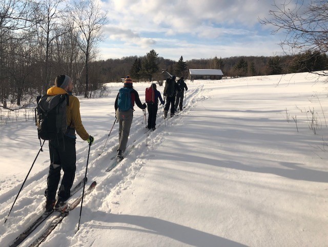 At that instant, from out of the woods on the trail behind us, that we had just skied, came a skier. Charging through the wind and snow like a Clydesdale in full stride, with his head down, he was about to ski right by us without saying “Hello.” We raised our arms and let out a “Yo!” in unison. Startled, the skier looked up as if being awakened from a trance. I said to him, are you coming up from the Monroe Trail? Obviously, he couldn’t be coming from the Challenge Trail, we had just swept it.